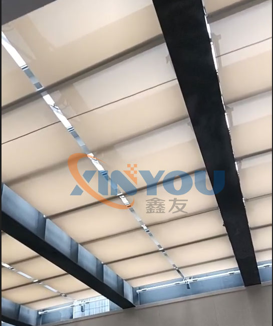 頂面系統(tǒng)選用FSS電動(dòng)遮陽(yáng)簾,即每套陽(yáng)簾系統(tǒng)包含一套管狀的驅(qū)動(dòng)電機(jī)和一套FSS專用的彈簧機(jī)構(gòu)系統(tǒng)通過(guò)電機(jī)帶動(dòng)卷繩器的旋轉(zhuǎn)拉動(dòng)鋼絲,牽引面料,從而達(dá)到陽(yáng)作用。電機(jī)反轉(zhuǎn)則可通過(guò)彈簧的反作用力收回面料,可實(shí)現(xiàn)采光效果。