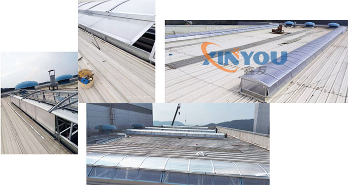 2. 圓拱型電動采光排煙天窗主要材料通常采光不同規(guī)格的鋁型材,采光材料一般使用PC陽光板或FRP采光板,天窗頂部為拱型,其好處是可以折射陽光擴大室內(nèi)采光面積,且拱型的窗面利于夏季排雨,冬季又不易積雪,本身的自潔性較好,表面浮塵雨水沖刷,經(jīng)常保持較好的采光效果。