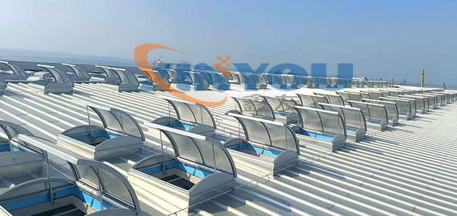圓拱形的設(shè)計,外觀優(yōu)美、通風(fēng)排煙兼顧自然采光,開啟角度一般為30度到45度***開啟角度為90°。