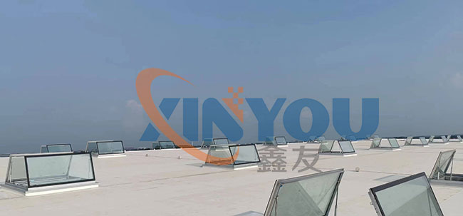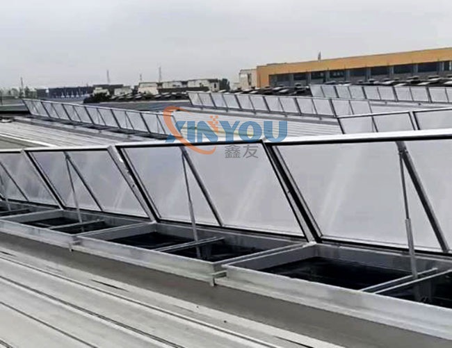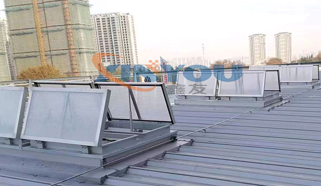 鑫友工業(yè)類電動消防排煙天窗主要適用于廠房等工業(yè)類大型建筑的屋頂采光、通風(fēng)、排煙,設(shè)計依據(jù)建筑標準設(shè)計圖集09J621-2。